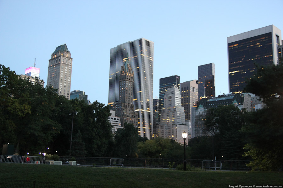 В Нью-Йорке много прекрасного, но самое замечательное что там есть — центральный парк. В самом центре здоровенного мегаполиса с сотнями небоскрёбов находится парк площадью в 3400 гектар! Тут и озера и небольшой лес, и большие лужайки, и аллеи, и свой зоопарк. Я пришёл в парк уже в сумерках и даже успел в нём заблудиться (дорожки все идут большими дугами).